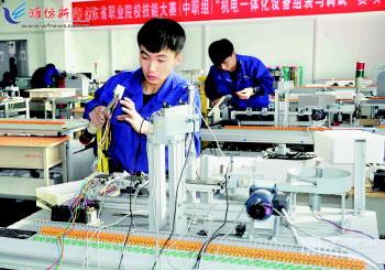 11月27日,参赛选手在参加机电一体化设备组装与调试项目的比赛。当日,由省教育厅、省人社厅等主办,潍坊职业学院承办的2015年山东省职业院校技能大赛中职组加工制造类三个赛项在滨海校区举行。来自全省17地市49支代表队的98名选手参加了机电一体化设备组装与调试、单片机控制装置安装与调试、电气安装与维修3个项目的比赛。 记者王晓光 通讯员葛树强摄