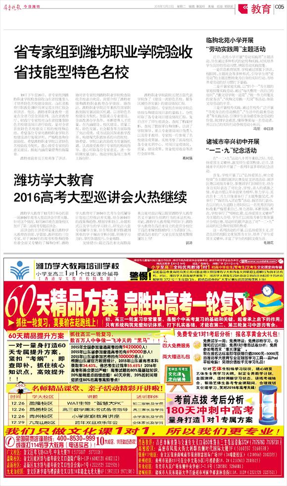 19日下午至20日,省专家组到潍坊职业学院检查验收山东省技能型人才培养特色名校建设情况。山东省教育厅职教处调研员刘宝君主持汇报会并讲话。他说,潍坊市职业教育一直走在全省乃至全国前列,这次省教育厅、财政厅专家组对山东省技能型特色名校建设项目进行验收,是对全省首批特色名校建设工程的梳理和总结,希望各位专家对潍坊职业学院名校建设进行客观评判、严格检查和全面验收,希望潍坊职业学院以省特色名校验收为契机,虚心接受专家组的意见建议,掀起内涵质量提升的新篇章。