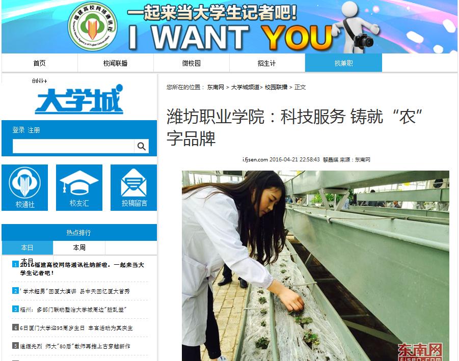 东南网4月21日讯(本网记者黎晶瑛)“名师多、教授多、博士多、专家多”,科技创新与社会服务的“农”字品牌是潍坊职业学院的一张闪亮“名片”。4月21日,“职教看山东”2016全国重点网络媒体行走进潍坊职业学院,深入了解他们的传统优势专业农林类专业。
