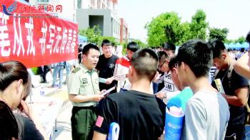6月4日,“2016年驻潍高校大学毕业生专场招聘会”在滨海区举行。在招聘会现场,潍坊军分区寒亭区人武部征兵工作人员开展大学生参军入伍优惠政策现场咨询宣传活动,众多学子踊跃咨询。