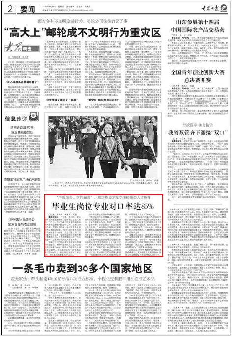 “我们坚持专业发展融入产业发展,面向当地及周边支柱产业,广泛与当地行业、企业开展联合办学,形成了‘全员参与、全程对接、全方位服务’的紧密型校企合作格局。”潍坊职业学院院长王家爱说,学院主动面向地方经济优先发展的先进制造业、现代服务业等领域,与数十家大型企业开展深层次合作,共建校内实习实训基地。