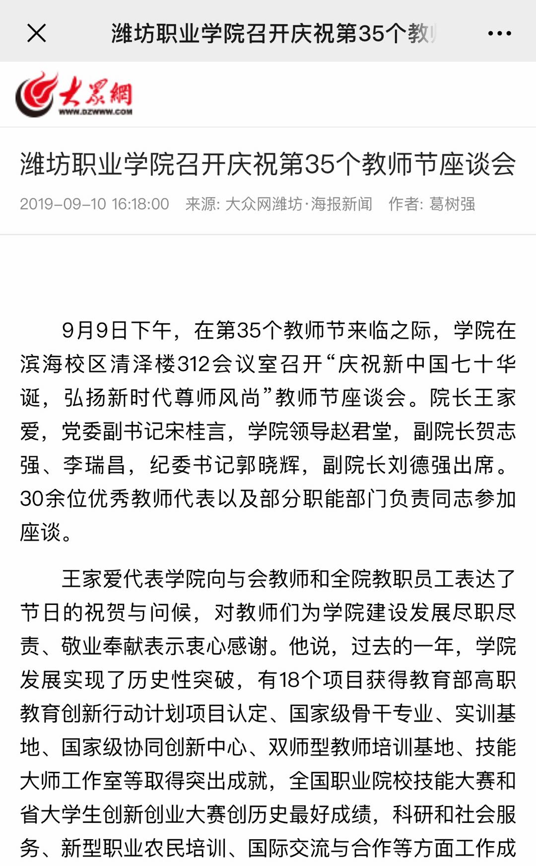 [大众网]潍坊职业学院召开庆祝第35个教师节座谈会