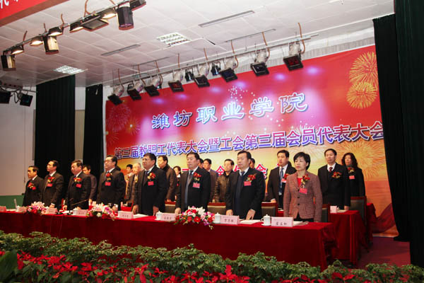 12月6日下午2点30分,雄壮的国歌声中,学院第三届教职工代表大会暨工会第三届会员代表大会第三次会议在报告厅隆重开幕。潍坊市政府党组成员、学院党委书记陈仁杰,院长王家爱,党委副书记娄树军,副院长宋桂言、赵君堂、贺志强,纪委书记毕建华等出席开幕式并在主席台就座。306名正式代表、7名特邀代表和35名列席代表参加了大会。