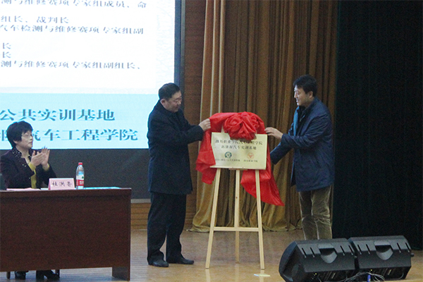 宋桂言和许京波共同为潍坊职业学院汽车工程学院新能源汽车实训基地揭牌。