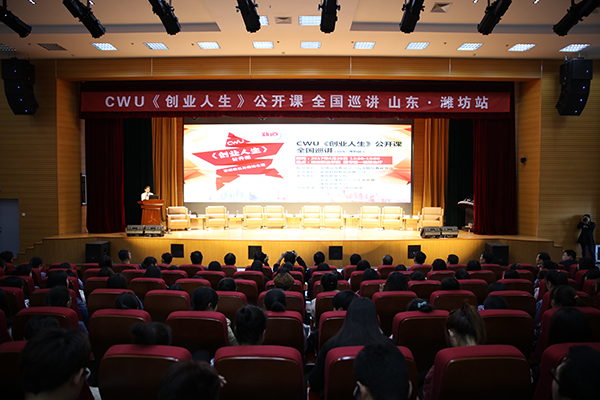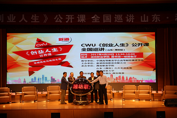 4月20日下午,由中国高等教育学会财经分会指导、新道科技股份有限公司主办、潍坊职业学院承办的CWU《创业人生》公开课全国巡讲活动在学院滨海校区图书馆报告厅举行。中国高教学会高等财经教育分会副理事长张国才、山东商业职业技术学院院长钱乃余、潍坊创业大学校长孙友欣等领导,学院院长王家爱、副院长贺志强出席活动。学院500余名师生代表参加了本次活动。