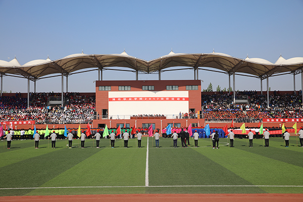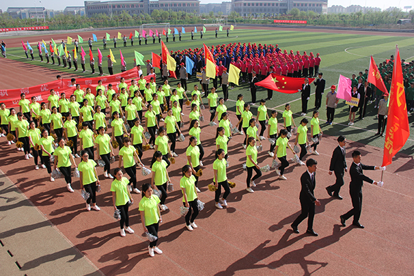 伴随着激昂的运动员进行曲,国旗队、彩旗队、裁判员队及各代表队依次入场。一支支队伍迈着整齐有力的步伐走过主席台,展现出潍职师生奋发昂扬的崭新姿态。