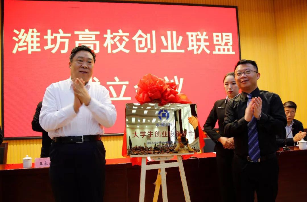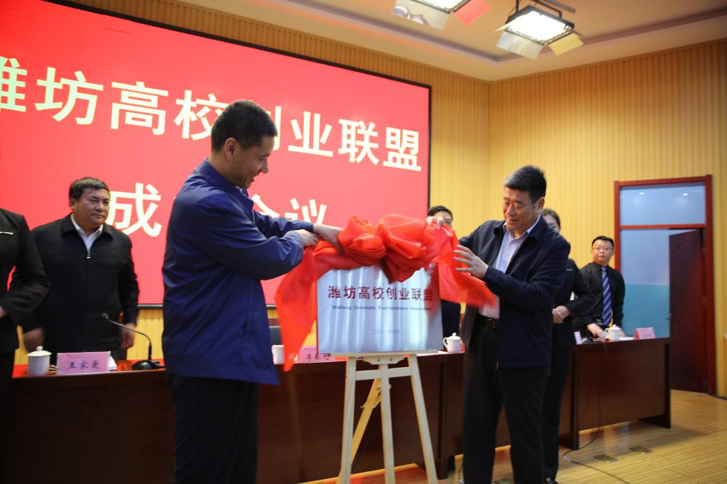 李春光、李广敬一起为“潍坊高校创业联盟”揭牌,张洪全、聂颖超共同为潍坊职业学院大学生创业基金揭牌。