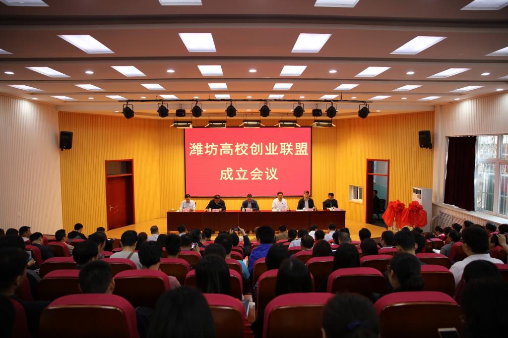 5月10日上午,潍坊高校创业联盟成立大会在学院奎文校区隆重举行。山东省教育厅学生就业创业教育咨询中心主任李春光,学院党委书记张洪全,院长王家爱,潍坊市委教育工委副书记、高等教育办公室副主任李广敬,市大学生创新创业管理服务中心主任王术平,浙江水滴股权投资基金管理有限公司执行董事聂颖超出席,学院领导、驻潍高校分管创新创业教育工作领导和主管创新创业教育处室负责同志及我院教师代表130余人参加会议。王家爱主持成立大会。
