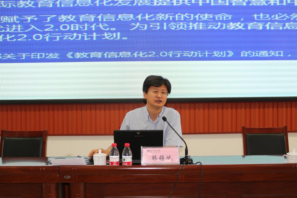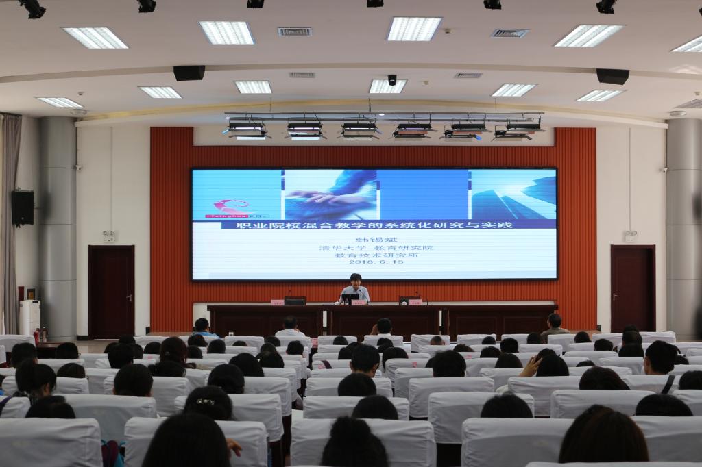 为创新教学模式,提升教师教育教学质量,加强学院课程建设,加快推进学院优质校建设工作,6月15日,“优质校建设大讲堂”第五讲在学院滨海校区清泽楼报告厅举行。学院邀请现任清华大学教育研究院副院长、博士生导师韩锡斌教授做了题为《职业学院混合式教学的系统化研究与实践》的报告。院长王家爱,党委副书记宋桂言,副院长贺志强、李瑞昌出席报告会,各职能部门、信息化混合式课程主持人近300人参加了报告会。李瑞昌主持报告会。