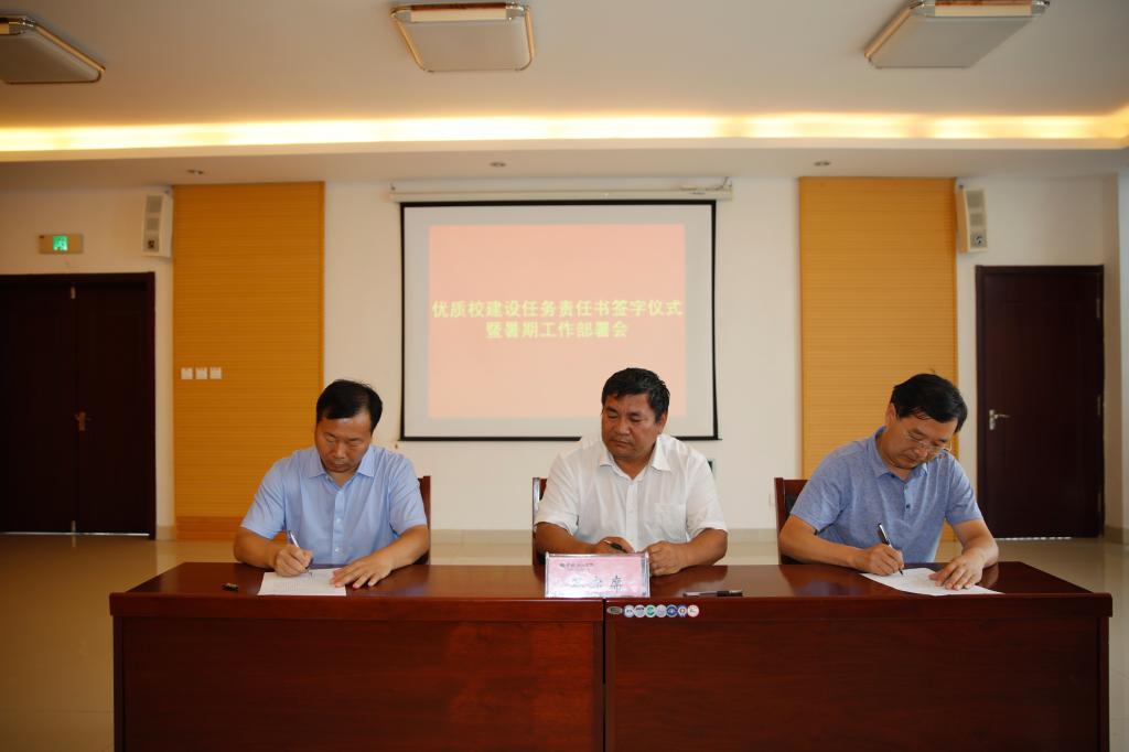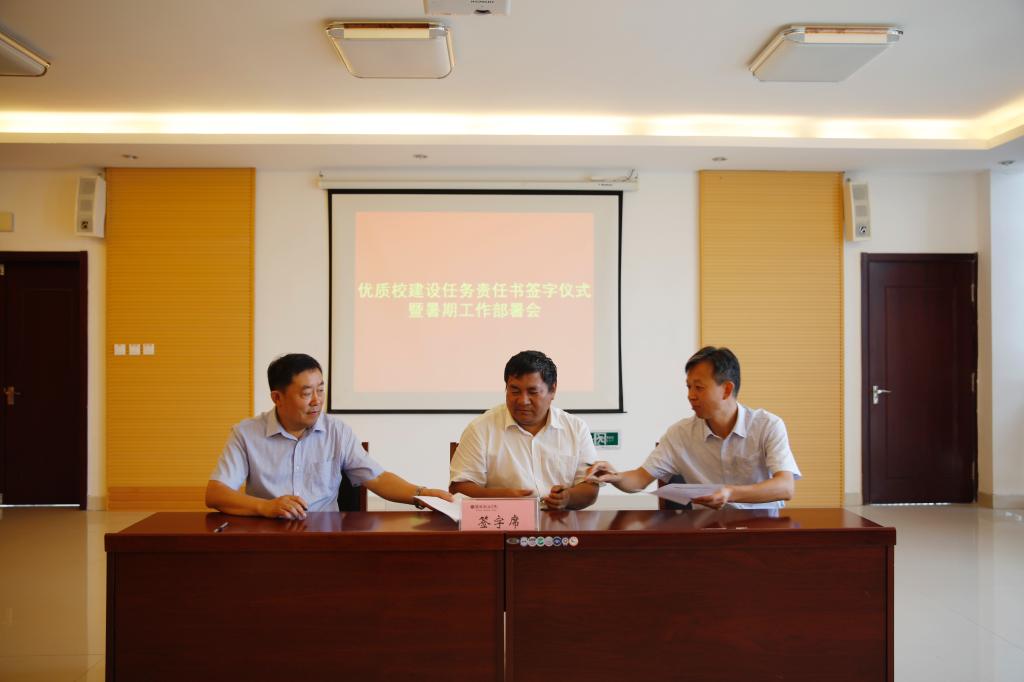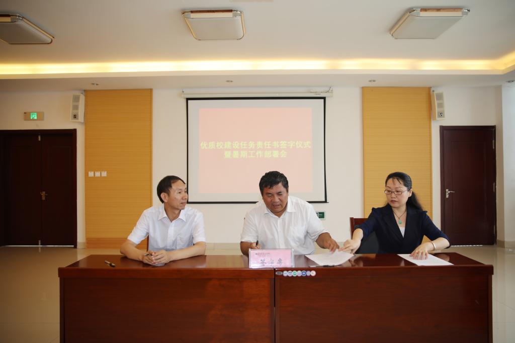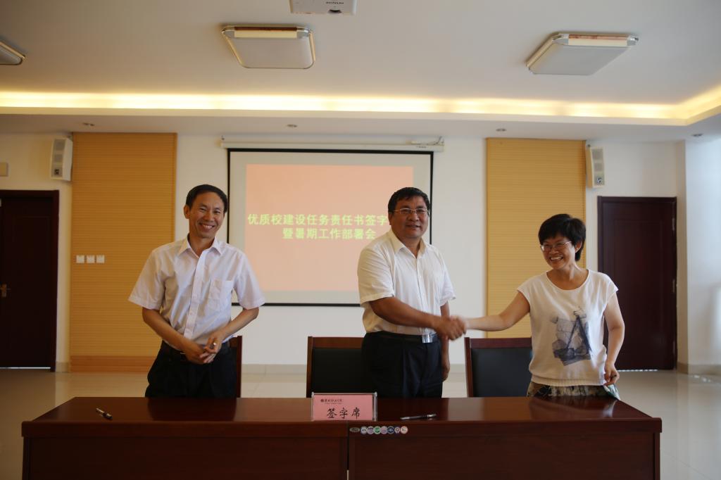 7月12日上午,学院优质校建设任务责任书签字仪式暨暑期工作部署会在滨海校区312会议室召开。学院院长王家爱,党委副书记宋桂言,副院长赵君堂、贺志强、李瑞昌,党委委员、办公室主任谭明出席会议,学院优质校建设领导小组成员、优质校建设办公室成员、各二级学院院长和教学院长参加会议。李瑞昌主持会议。