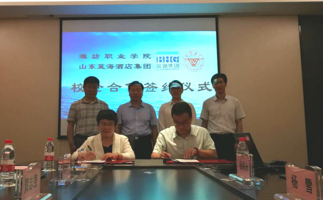 9月6日上午,我院与山东蓝海股份有限公司战略合作协议签署及校外实训基地授牌仪式在潍坊蓝海大饭店举行。学院副院长贺志强,山东蓝海股份有限公司人力资源部副总经理杨兆永出席仪式,科技处、国际商务学院负责同志参加活动。