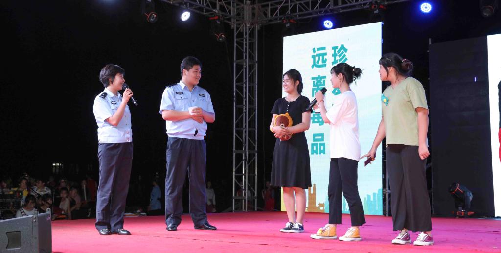 晚会开始之前,禁毒青年志愿者为同学们做现场讲解并发放禁毒主题纳凉扇及宣传彩页;晚会期间,禁毒支队相关负责同志与现场观众进行了禁毒知识互动问答。