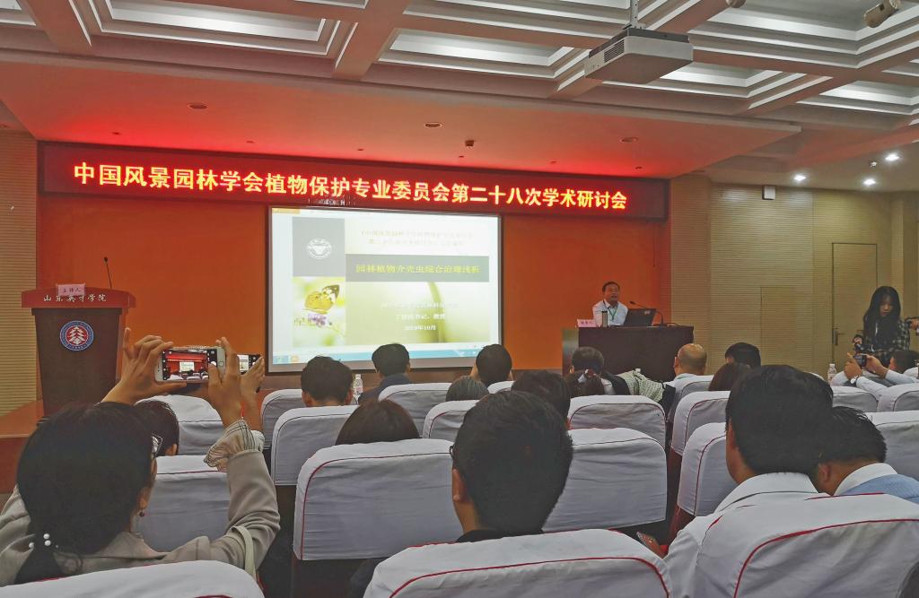 中国风景园林学会植物保护专业委员会第二十八次学术研讨会于10月23至24日在济南召开,本次会议由中国风景园林学会植物保护专业委员会主办,济南市园林和林业绿化局、济南祥辰科技有限公司承办,来自全国26个省(市、自治区)49个城市园林植保专委员会委员、各地园林植保从业者、各相关高校、科研单位以及从事农药与药械生产、园林景观设计与绿化工程等相关单位290余人出席会议,我院丁世民教授应邀参会并作了题为《园林植物介壳虫综合治理浅析》的学术报告。