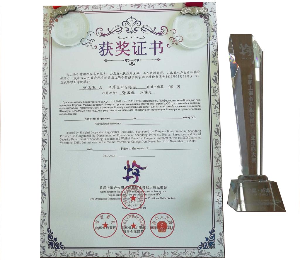 11月11日,以“增进友谊、展示技能、共赢发展”为主题的首届上海合作组织国家职业技能邀请赛在威海职业学院开赛。经过层层选拔、评选,我院文化创意学院教师郭西燕、刘德亚指导的梁高惠同学的作品在艺术设计与绘画项目比赛中获得银奖。