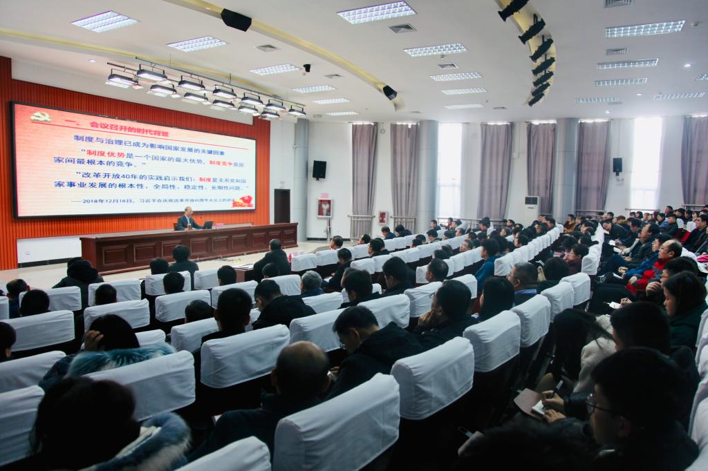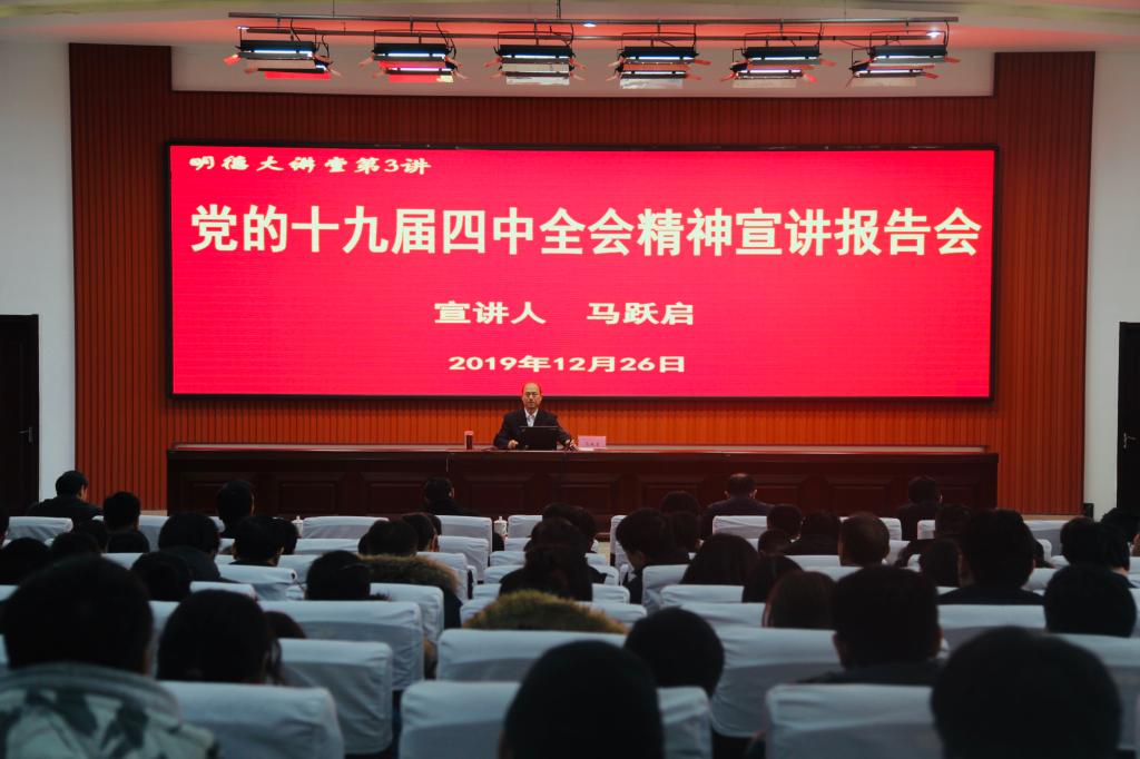 为深入学习宣传贯彻党的十九届四中全会精神,进一步用全会精神统一思想、凝聚共识,根据市委统一部署,12月26日上午,学院党的十九届四中全会精神宣讲报告会在清泽楼报告厅举行,党委书记马跃启同志作宣讲报告。学院领导宋桂言、赵君堂、李瑞昌、郭晓辉、刘德强,学院中层干部和教师代表、学生代表参加报告会。