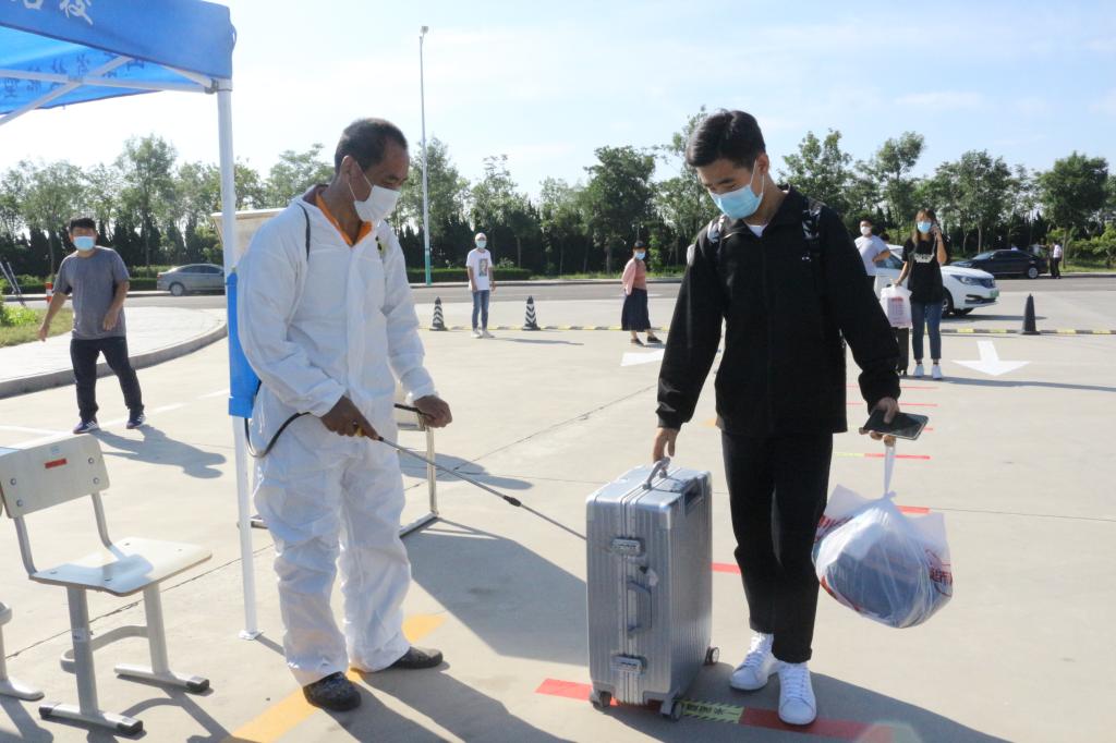 此次演练主要针对学生返校、入住公寓两个场所进行了全流程、全仿真多轮模拟演练。在返校报到入口,模拟演练乘私家车返校、乘公交车返校报到流程,对学生进行消杀消毒、体温检测、身份核验,重点演练了发现学生发热应急处置程序。在学生公寓,学生排队消毒、测量体温,通风入住,演练了学生自感身体不适应急处置流程。