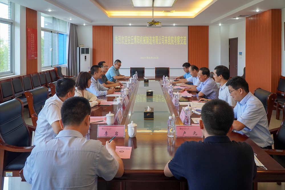 9月24日上午,安丘博阳机械制造有限公司总经理闫吉祥一行4人在共青团潍坊市委副书记张宝军、于涛陪同下,来我院考察交流。学院党委副书记、副院长桑福岭陪同考察交流。团委学生工作处、科技处、机电工程学院、信息工程学院负责同志参加座谈交流。