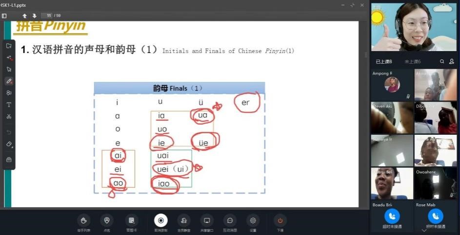 第一课中,教师与学生亲切互动,向学生介绍了课程基本情况、授课软件的使用方法等,运用生动有趣的导入方式进行了中文入门教学,极大地调动了学生的积极性与参与性。学生们展现出高昂的学习热情、浓厚的学习兴趣,纷纷表示中文学习体验是全新而愉快的,一定会努力学习中文。