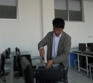 去年暑期,学院喜迁滨海校区,王老师积极投入到了这场大会战之中。作为实训中心工作人员,他在七月份接到了滨海校区设备搬迁的工作任务,成为信息工程学院第一批入驻滨海校区的先驱人员。那时的滨海校区尚处在建设当中,生活条件还不够完善,从饮食到住宿,都比较艰苦。就这样,他经历了学院餐厅从无到有,忍受着白天的炎热和晚上蚊虫的叮咬,全身心投入实训室建设,度过了一个非常艰苦的暑假。自接到通知到9月份学生开学,只有短短一个多月的时间,时间特别紧,任务非常重,他全力以赴地投入了工作。寒亭校区原有4个旧微机室的设备要进行清理并搬迁到滨海校区,同时要新建5个微机室、3个一体化实训室、一个电子商务线下服务中心和一个综合布线实训室,工作头绪繁多,新进设备需要接收、维护,还要监督实训室的施工质量,督促施工进度。实训中心的这些工作已经让他应接不暇了,但当他得知新生班主任有空缺时,又担任起了2013级软件外包班的班主任工作。他要在奎文校区迎接新生、参加军训,还要去滨海校区整理实训室,工作量多大可想而知,但他从来没有向领导诉过一句苦、说过一句累。2012级学生正式入驻滨海前的最后一周是最紧张忙碌的一周,他从早忙到晚,不用说午休了,有时候连饭都顾不得吃一口,午餐也变成了晚饭。就这样,在学生开学之前的最后一天将所有实训室整理完毕,确保学生一入驻滨海校区就可以进行正常的实训学习,一刻也没有耽误。