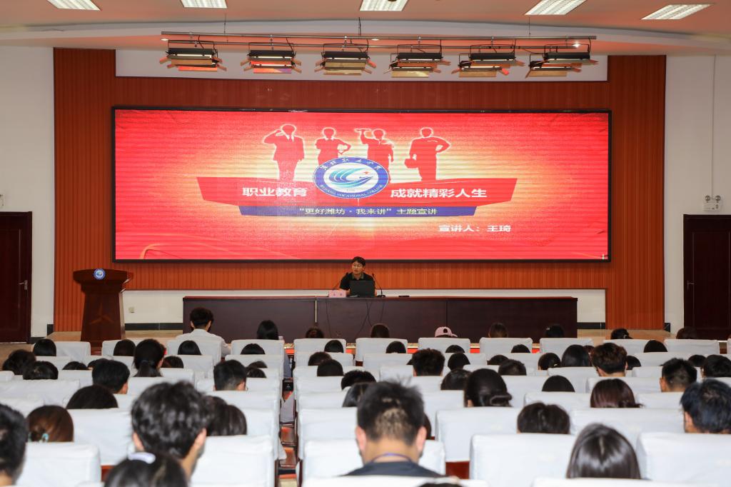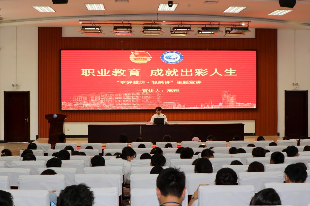 根据市委宣传部工作安排,6月4日,学院在滨海校区北区清泽楼报告厅举行了“更好潍坊·我来讲”主题宣讲报告会。本次宣讲主题为“职业教育成就出彩人生”,由机电工程学院王琦同学和经营管理学院高翔同学担任主讲人,学生代表约300人参加报告会。