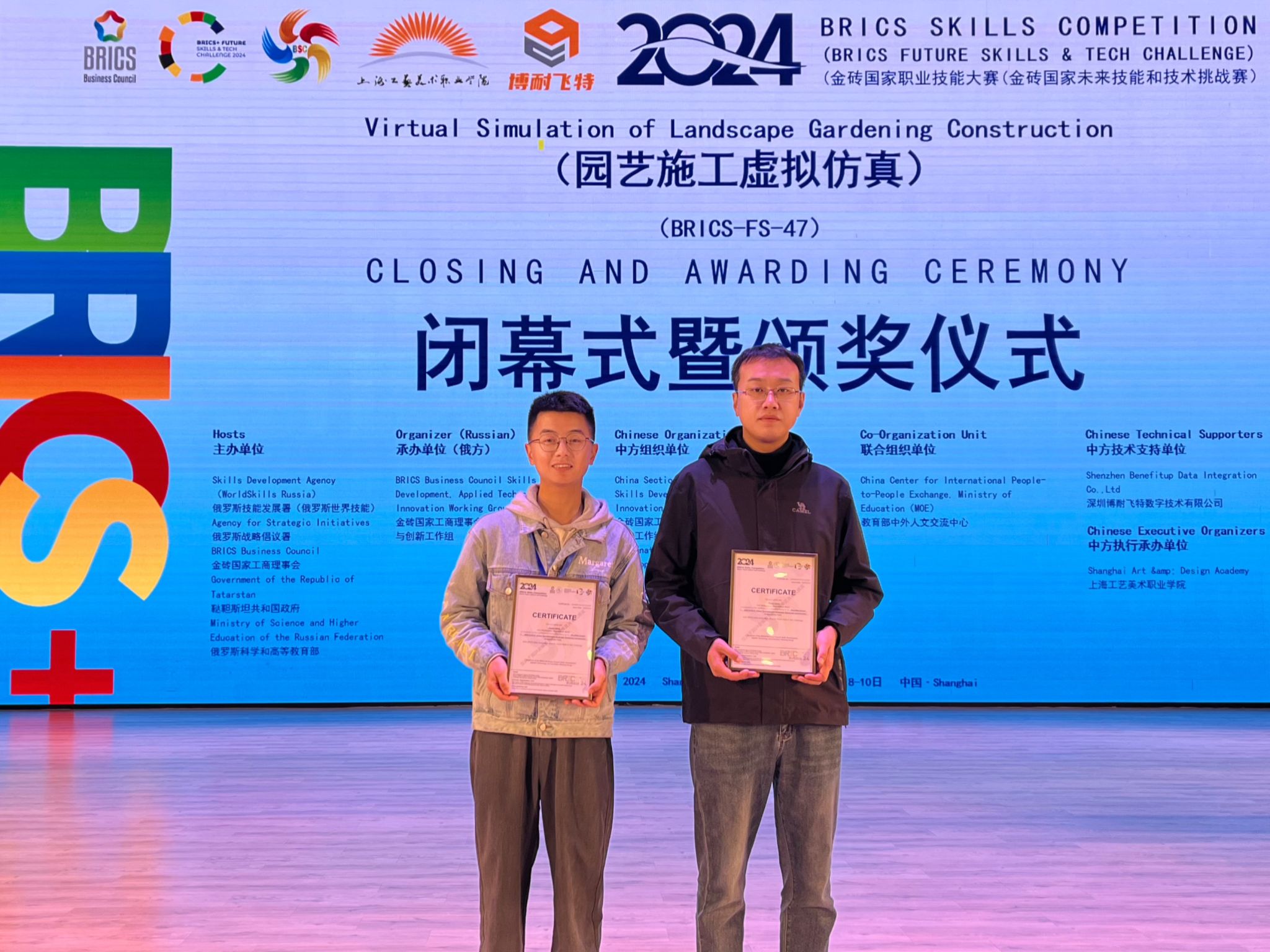 2024年11月8日至10日,2024金砖国家职业技能大赛园艺施工虚拟仿真赛项中国分赛区国际总决赛在上海工艺美术职业学院嘉定校区成功举办。本次赛事经过全国区域选拔,共有来自6个国家的58支队伍参赛,参赛选手涉及各高等院校、高职院校及企业人员,选手年龄均35岁以下。经过激烈角逐,由农林科技学院黄伟男、宋帅振两位老师组成的潍坊职业学院代表队,在赛场上展现了专业的技能水平和良好的综合素质,荣获一等奖。