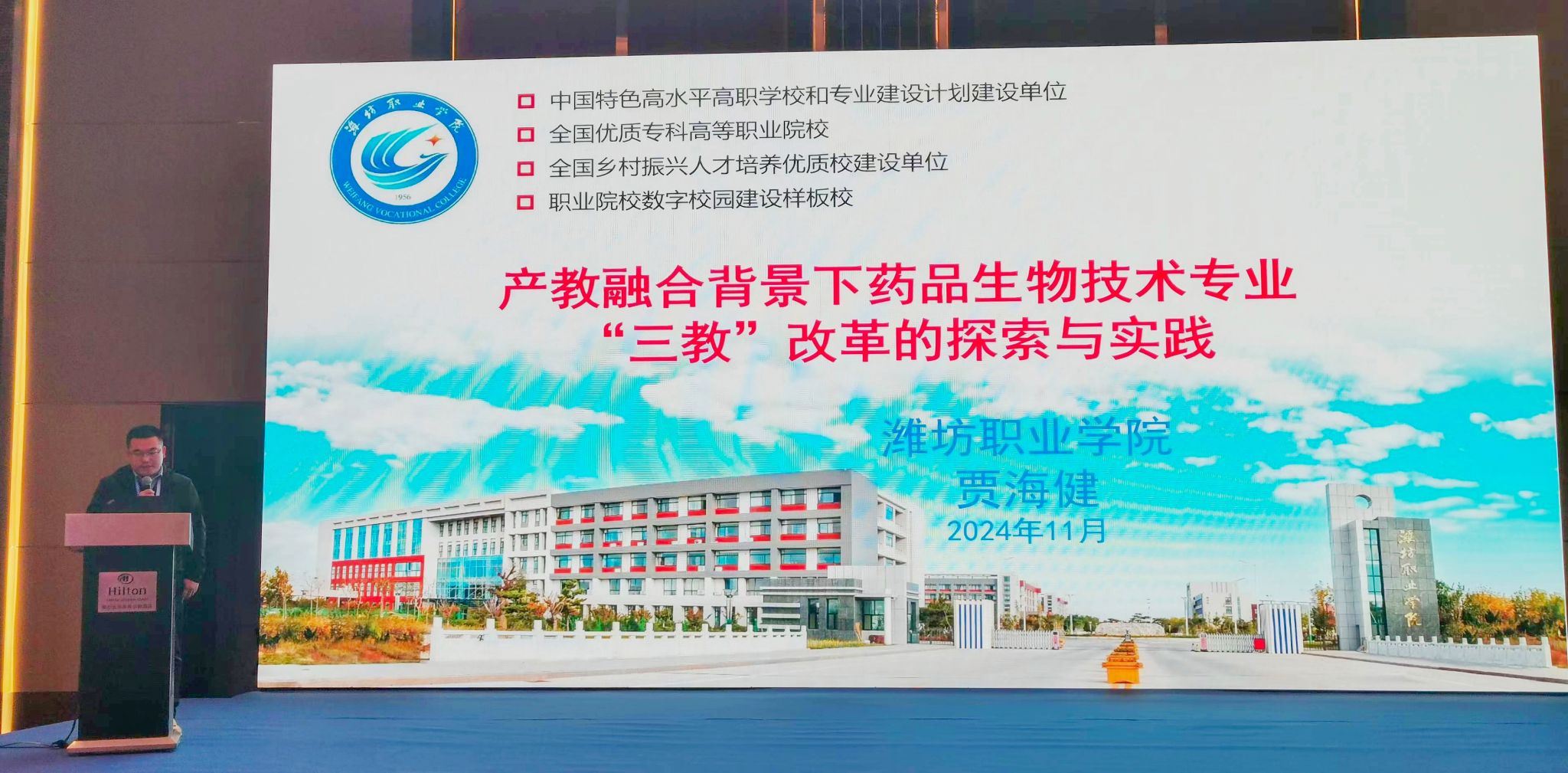 在随后召开的全国生物技术职业教育年会上,食品药品学院贾海健老师以《产教融合背景下药品生物技术专业“三教”改革的探索与实践》为题作典型发言,受到与会全国职业院校生物技术领域专家同行一致好评。会上还为2023年结题教改项目、2024年立项教改项目和年会优秀论文颁发证书,学院共有8个项目入选。