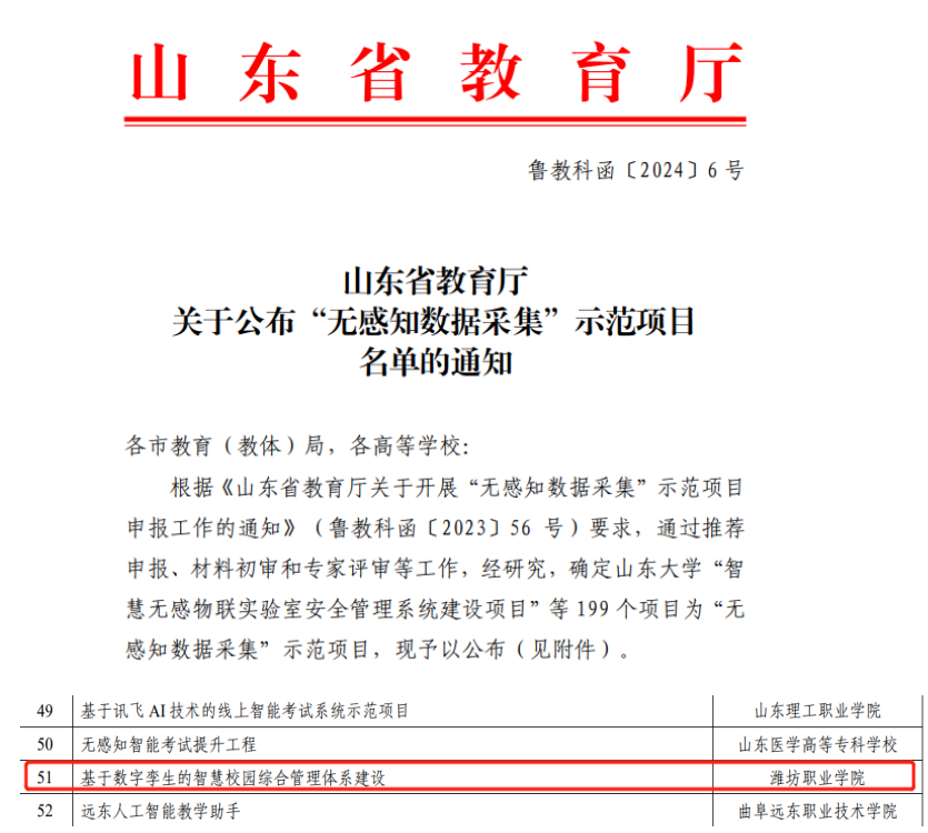 近日,山东省教育厅发布《关于公布“无感知数据采集”示范项目名单的通知》(鲁教科函〔2024〕6号),学院“基于数字孪生的智慧校园综合管理体系建设”入选全省“无感知数据采集”示范项目。该项目旨在通过遴选优秀的“无感知数据采集”教育数字化实践解决方案,培育 “无感知数据采集”教育数字化应用的新场景、新模式,树立可复制推广、可规模应用的“无感知数据采集”项目发展标杆。